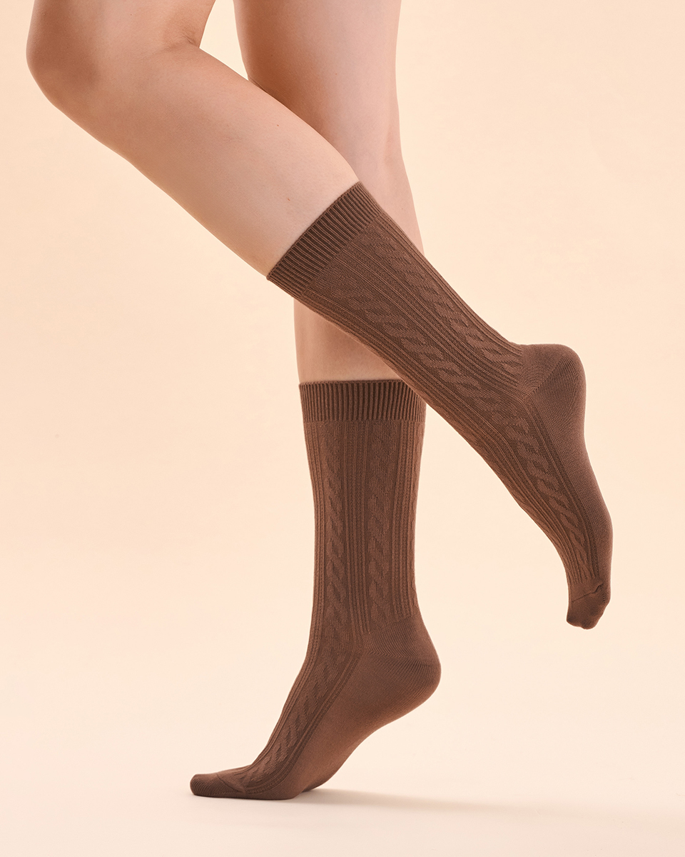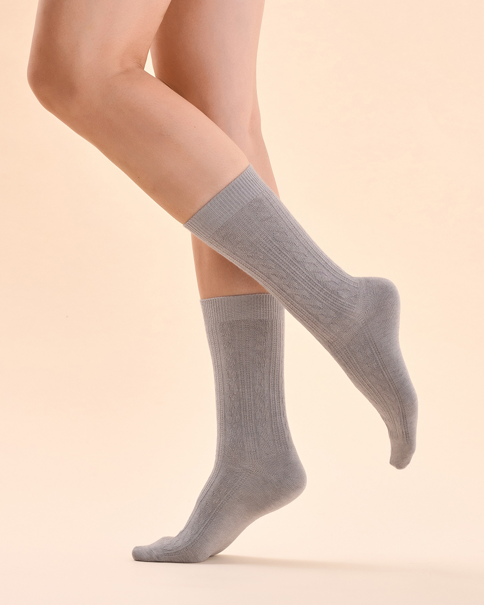 Wyjątkowo miękkie damskie skarpetki z kaszmirem w piękny, swetrowy wzór to idealny model na chłodne dni. Swetrowy, ozdobny splot wpisuje się w nowoczesne trendy. Dzięki wyjątkowemu składowi dzianiny z przewagą kaszmiru skarpetki mają właściwości termoregulacyjne, otulając komfortowo stopy. Domieszka poliamidu i elastanu sprawiają, że skarpetki są elastyczne i trwałe.